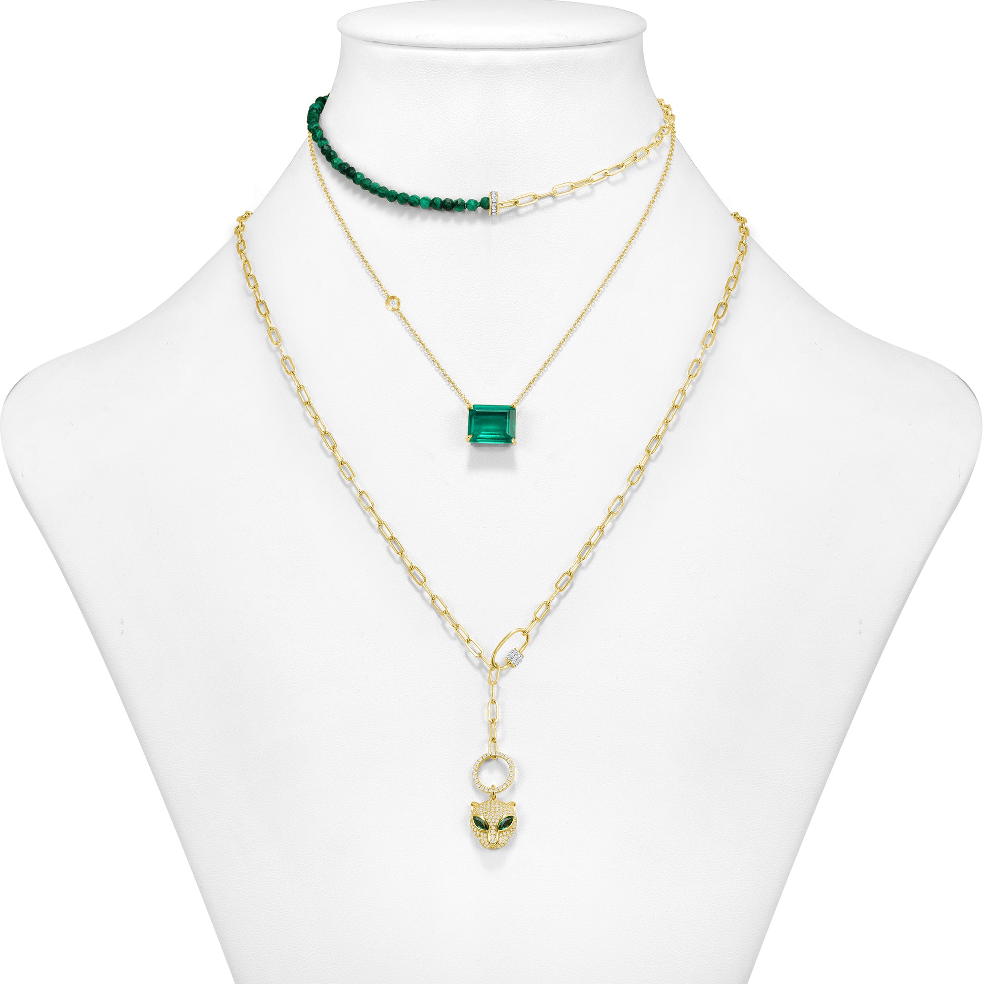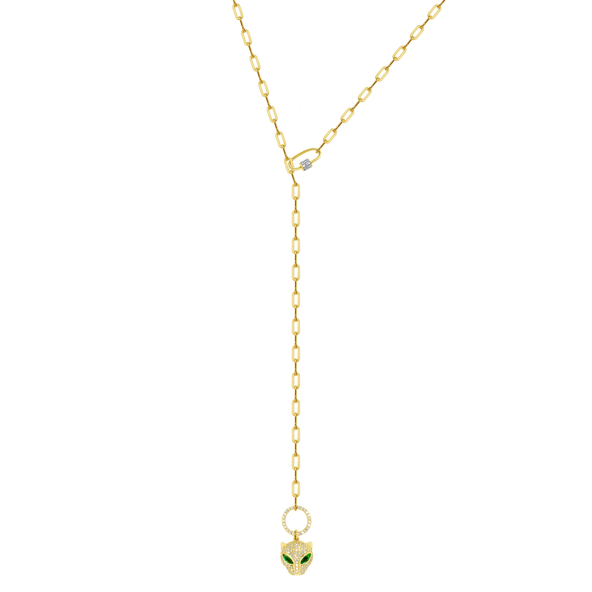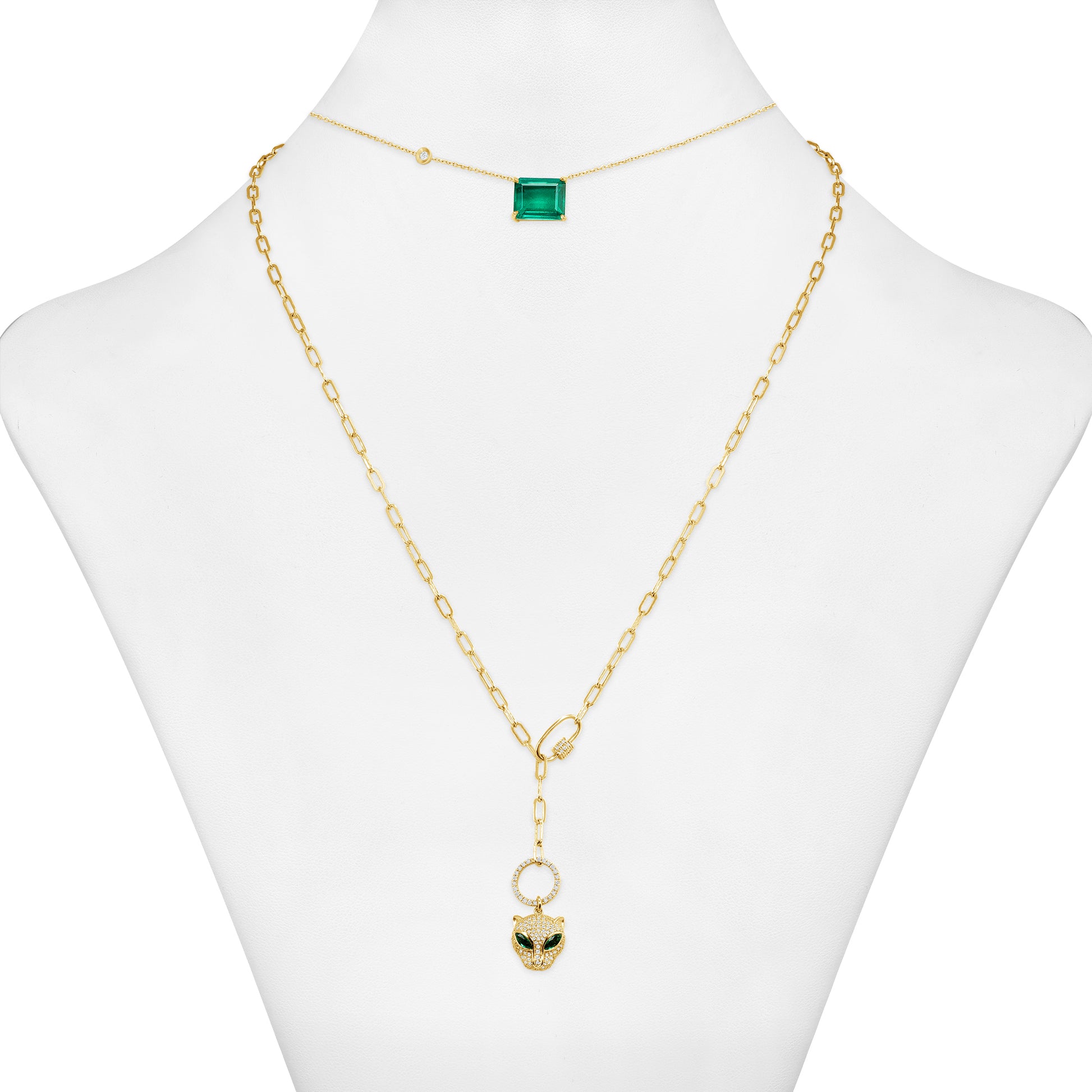 Paper Clip Chain in 14k Yellow Gold with Carabiner Diamond Clip and a Hanging Diamond and Emerald Cat Head with 0.45ct. Round Diamond. $1,850.00