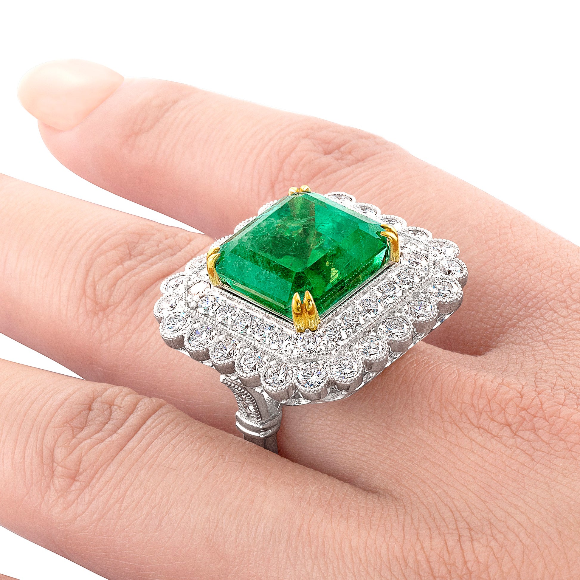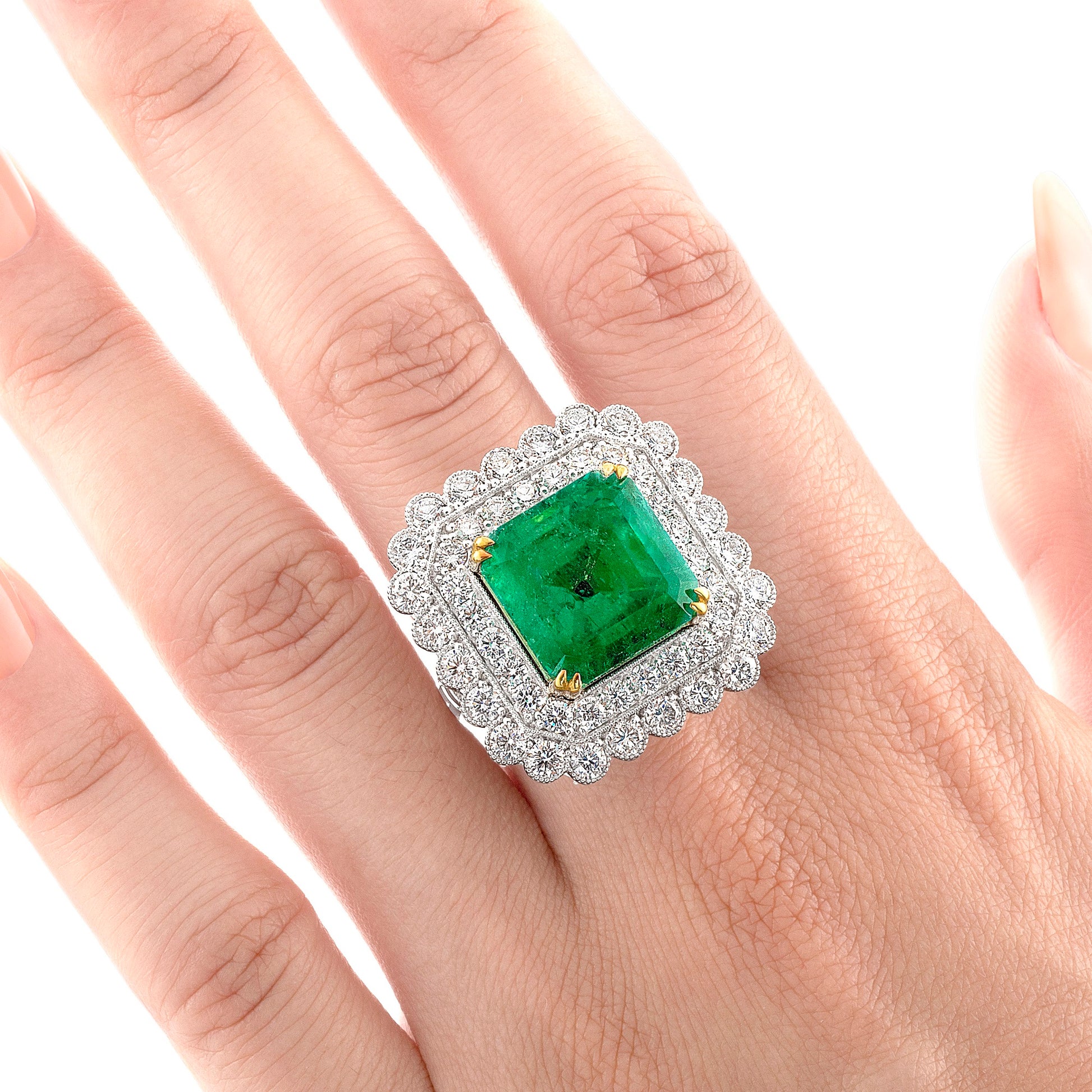 This Classy Emerald Lady's Ring features 21.90Gr with 12.15Ct Emerald and 4.20Ct Roudn Diamonds sets in 14K White Gold. Please call for availability.