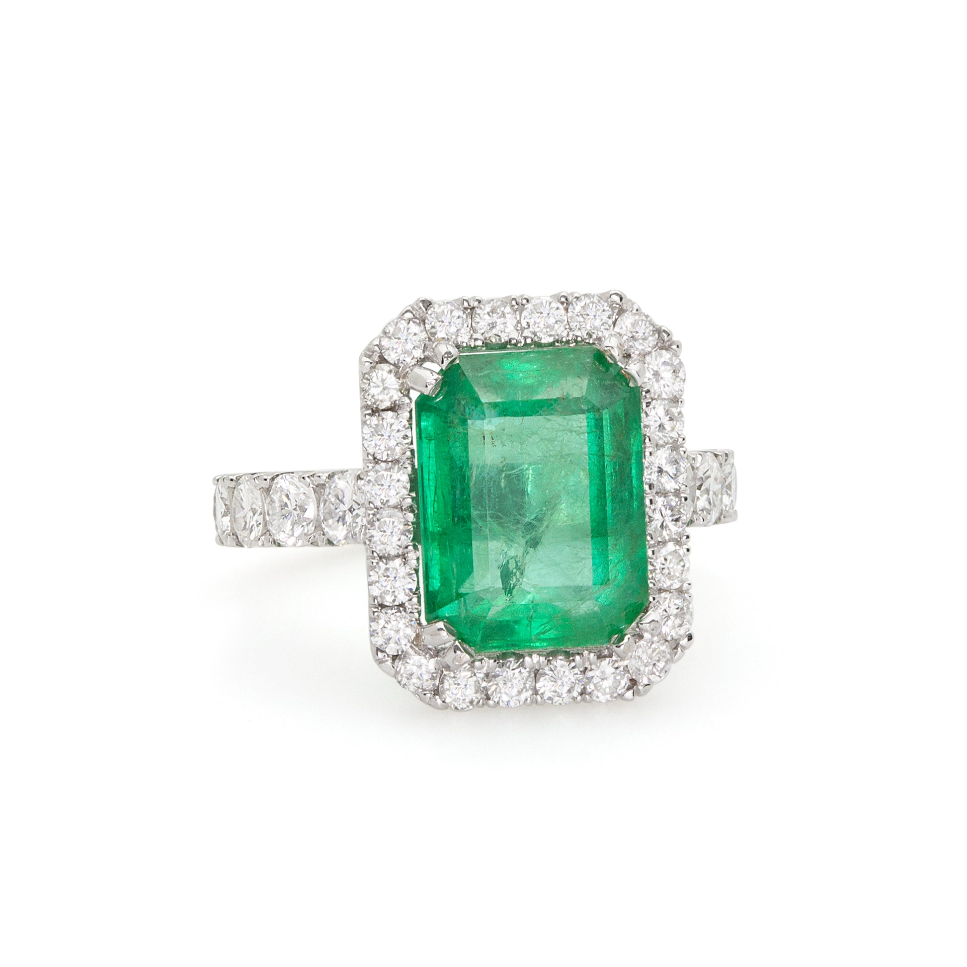 This Beautiful Lady's Ring features 7Gr with 5.90Ct Emerald and 1.80Ct VS1 Side Round Diamonds Set in 18K White Gold.