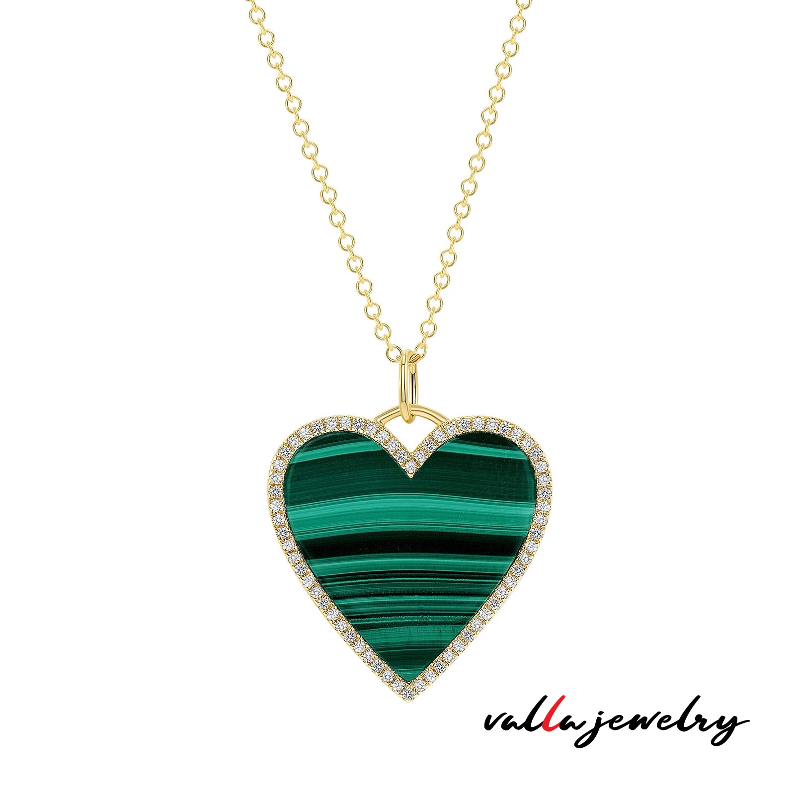 14k Yellow Gold Green Malachite Heart Necklace With Diamonds V0216