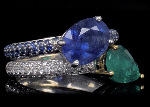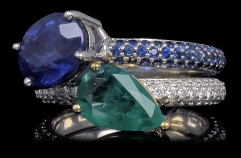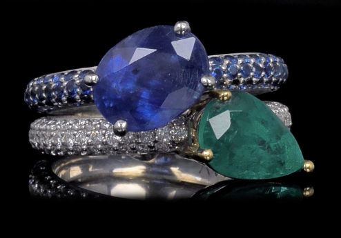 18k White Gold Diamond Sapphire Ring with Emerald Birthstone.