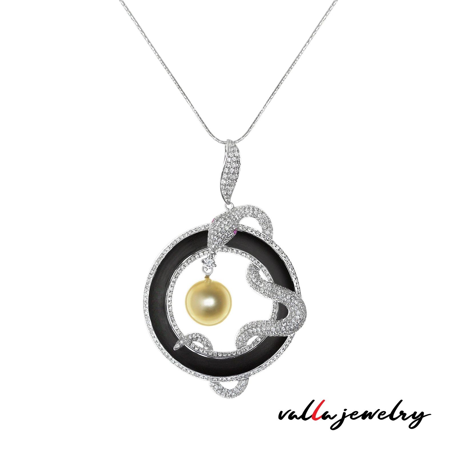 This Snake Pendant has 15Gr with Beautiful Gold Pearl and Onyx and 2.60Ct Round Diamonds set in 18K White Gold.