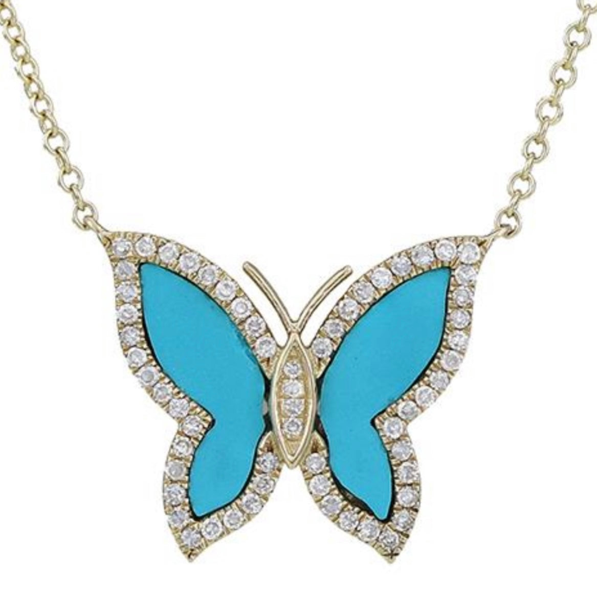 A Fashionable Turquoise Butterfly Necklace in White Gold 14k 14x17mm with 0.20ct. Round Diamond.